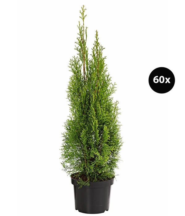 Sie denken bei Thuja auch sofort an die saftig grünen Hecken rund um die vielen Grundstücke? Na klar, denn Thujen sind bei uns die beliebtesten Heckenpflanzen. Sie bilden wunderschöne, dichte Hecken, welche im Sommer, wie im Winter, den Garten zu einer grünen Oase verwandeln. Der Lebensbaum überzeugt durch seine feinen, glatten, leicht glänzenden Nadeln, welche kegelförmig um die Pflanze wachsen. Gut zu wissen ist, dass Thujen kaum Ansprüche an ihre Umgebung stellen. Sie passen sich optimal an verschiedenste Umstände, wie festen oder sandigen Boden, an. Die extrem winterharten Pflanzen sind nicht nur in jungen Jahren schön anzusehen, sie behalten ihre dichte, gedrungene Form auch im hohen Alter. Thuja – die ideale Pflanze für immergrüne Sichtschutzhecken. Die Pflanzen sind bei Lieferung zwischen 60 und 80 cm hoch und erinnern bereits bei der Pflanzung an die spätere Hecke.