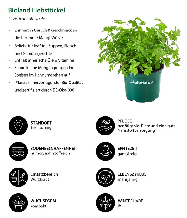 Der Liebstock liebt einen sonnigen und hellen Standort sowie einen humosen, nahrhaften und tiefgründigen Boden. Wenn die Rhizome der Kräuter geteilt werden, kann Liebstöckel sehr einfach vermehrt werden. Die Pflanze benötigt nicht viel Pflege, außer Düngergaben mit Kompost und Wassergaben bei längeren Trockenperioden. Die Pflanze wächst zwar selbst sehr schnell, hemmt allerdings das Wachstum von anderen Pflanzen. Lassen Sie deshalb genügend Abstand zu anderen Kräutern oder Gemüse.