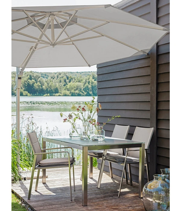 Sonnige Sommertage sind herrlich, aber leider auch schnell unangenehm heiß und gefährlich für unsere Haut. Deshalb brauchen wir für unsere Sitzplätze im Garten, auf der Terrasse oder dem Balkon einen guten Sonnenschutz. Unter dem Dach, das der Dehner Ampelschirm Zypern über Ihren Sitzplatz im Freien spannt, können Sie den Sommer unbesorgt und in vollen Zügen genießen. Denn mit seinen stattlichen Maßen von 300 cm im Durchmesser und dem seitlichen Mast stellt der Dehner Ampelschirm Zypern eine ganze Tischgruppe in den Schatten, ohne dass ein Mittelfuß kostbaren Platz wegnimmt. Nächster Pluspunkt: Der Schirm ist schwenkbar. Das heißt: Sie können den Dehner Ampelschirm Zypern mit der Sonne um die eigene Achse wandern lassen und so Ihren Sitzplatz immer optimal beschatten. Und neigt sich am Abend die Sonne dem Horizont entgegen, lässt sich der Schirm sogar kippen, so dass Sie auch bei niedrigem Sonnenstand Schatten und angenehme Temperaturen genießen, während die ersten Steaks auf dem Grill ihren verführerischen Duft verbreiten. Genießen Sie den Sommer wohl behütet unter dem Dehner Ampelschirm Zypern – von morgens bis abends!