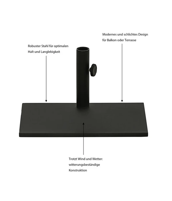 Sie haben sich für einen Sonnenschirm entschieden und benötigen jetzt noch einen stabilen Schirmstockhalter? Dann ist der Balkonschirmständer der Marke Dehner genau das Passende für Sie! Dank seiner schlichten Farbgebung und des dezenten Designs eignet er sich extra gut für viele unterschiedliche Einrichtungs- und Dekostile. Egal, ob Sie sich einen kunterbunten oder unauffälligen Schirm für den Balkon ausgesucht haben, der Dehner Schirmständer ist die perfekte Ergänzung dafür. Er kommt für Stockmaße von 35-38 mm infrage und wird Ihnen über viele Jahre einen guten Dienst erweisen. Aufgrund seines guten Eigengewichts von 20 kg ist er außerdem besonders stabil und widerstandsfähig.