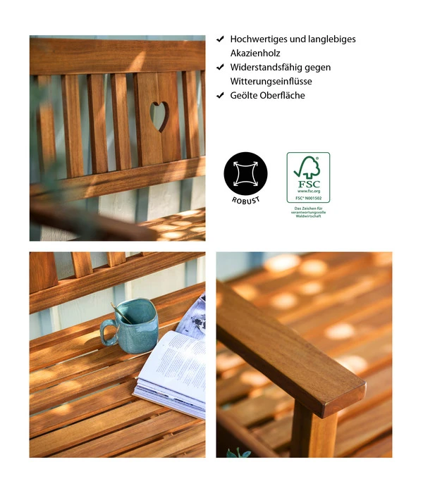 Bei Sonnenschein eine Tasse Kaffee zu genießen, dem Gesang der Vögel zu lauschen oder ein gutes Buch zu lesen, ist mit einer komfortablen Sitzgelegenheit gleich nochmal so schön. Die aparte, einladende Bank Heart punktet mit einer angenehmen Sitzhöhe und bietet genug Platz, sodass Sie die Freude teilen können. Schaffen Sie sich mit der bequemen Konstruktion aus Holz einen idyllischen Rückzugsort. Um Ihre Pausen noch gemütlicher zu machen, empfiehlt es sich, schnell ein passendes Polster mitzubestellen. Kuschelige Auszeiten warten auf Sie – sichern Sie sich Ihre persönliche Dehner Bank Heart und lassen Sie es sich gut gehen!