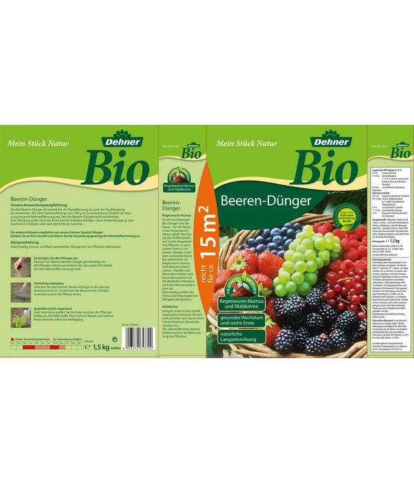 Der Dehner Bio Beeren-Dünger enthält eine Kombination aus Regenwurmhumus und Malzkeimen, die das aktive Bodenleben fördert. Regenwurmhumus entsteht aus organischen Stoffen, die von Regenwürmern kompostiert wurden. Er unterliegt keinen Fäulnisprozessen, enthält keine Krankheitserreger oder Unkrautsamen. Vielmehr versorgt er den Boden mit wertvollen Mikroorganismen und Enzymen, die das Wachstum und die Entwicklung der Pflanzen fördern. Bei Malzkeimen handelt es sich um einen rein organischen Universaldünger, der besonders die Wurzelbildung fördert, was sich im kräftigen Wachstum der oberirdischen Pflanzenteile bemerkbar macht. Mit dem Dehner Bio Beeren-Dünger unterstützen Sie Ihre Beerenpflanzen optimal und werden sich über eine leckere und reiche Ernte freuen können!