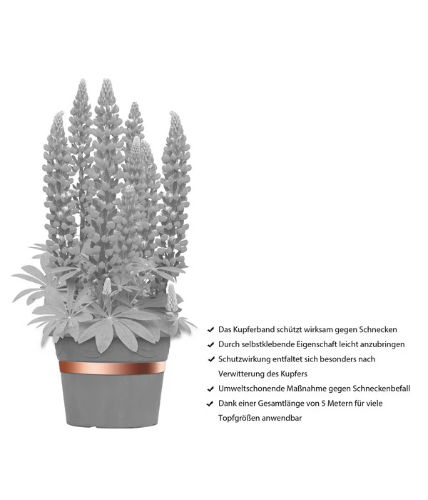 Das Dehner Bio Schneckenband aus Kupfer ist ein typisches Produkt der Bio-Sparte. Es verhindert den Befall Ihrer Topf- und Beetpflanzen durch eine leicht anzubringende, umweltschonende Maßnahme. Als einfacher Schneckenschutz wird das selbstklebende Dehner Bio Schneckenband aus Kupfer auf Töpfen, Kübeln oder Beetumfassungen angebracht. Nackt- und Gehäuseschnecken meiden das Kupfer, da es in Verbindung mit dem Schleim zu einer für die gefräßigen Tiere ungünstigen chemischen Reaktion kommt: die Schleimhaut wird durch Oxidationsprozesse geschädigt. Das Schneckenband aus Kupfer hat eine Länge von fünf Metern. Die beste Schutzwirkung entfaltet sich nach Verwitterung des Kupfers.