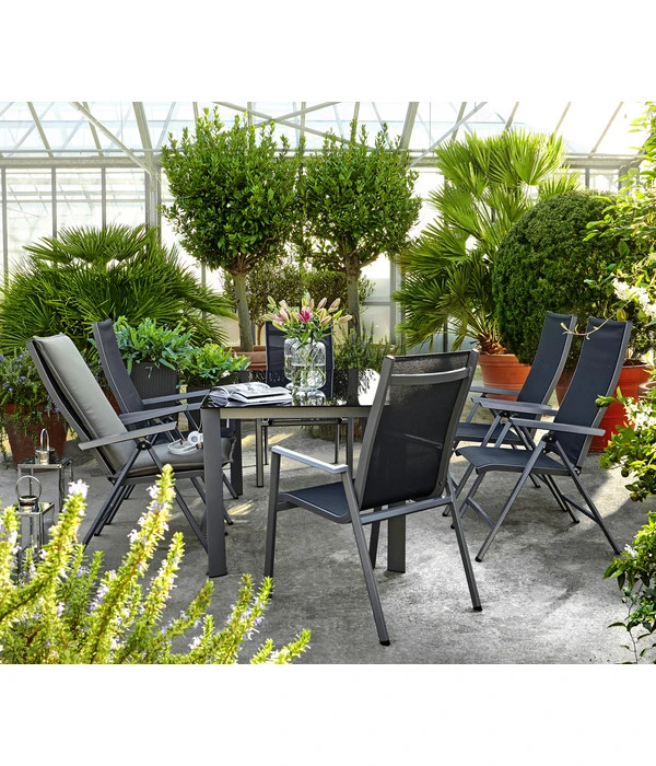 Die stabile Basis für den jahrelangen Einsatz unter freiem Himmel bildet das Gestell aus Aluminium. Dieses moderne Material verleiht dem Dehner Esstisch Macon die hervorragende Standfestigkeit und Witterungsbeständigkeit, bei gleichbleibend gepflegter Optik. Getoppt wird das Aluminium-Gestell durch die hochwertige Glasplatte. Das Glas ist • 8 mm dick, • beschichtet und so • robust, wie Sie es sich für den Gartenalltag mit Ihrer Familie nur wünschen können.