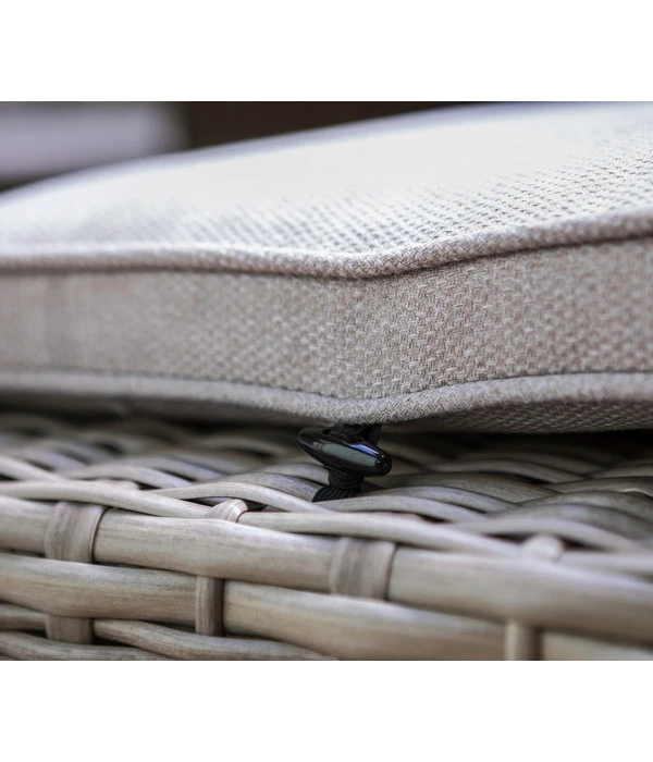 Dass die Dehner Geflechtlounge Bologna eine so immense Ausstrahlung besitzt, liegt an ihrem stilvollen Design. Hier fällt zuerst der Korpus der der Teile ins Auge, bei dem sich das handgefertigte Kunststoffgeflecht großflächig ums stabile Alugestell spannt. Mit seinem lebendigen Farbspiel, das sich wie bei natürlichem Rattan zufällig ergibt, verströmt es ein wunderbares Urlaubsgefühl. Das perfekt durch die hochwertigen Polster im passenden, hellen Farbton komplettiert wird und dank der Punktsteppungen im Rücken noch eleganter und komfortabler wirkt.