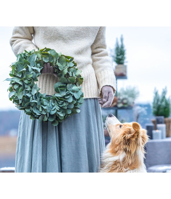 Noch ein Pluspunkt an dem Dehner Kranz Eukalyptus: Er kann absolut vielseitig eingesetzt werden. Als Türkranz an der Haustür- oder Wohnungstür, aber auch als frischer Schmuck an einer Wand oder als Tischschmuck auf dem Esstisch oder einer Abrichte. Und das indoor wie outdoor und zu jeder Jahreszeit, denn auch in getrocknetem Zustand ist er eine trendige Deko-Idee.