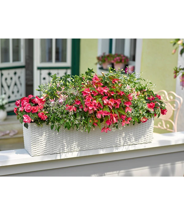 Bepflanzte Balkone und Fensterbretter schmücken nicht nur die Häuserfassade, sie vergrößern auch das eigene Wohlbefinden. Für das richtige Ambiente und den abgestimmten Gesamteindruck sind die optisch passenden Pflanzgefäße dabei oft ebenso wesentlich wie die eigentliche Bepflanzung. Deshalb möchten wir Ihnen mit unserem Dehner Kunststoff-Flechtkasten Dallas einen weiteren stilvollen Balkonkasten aus unserem reichhaltigen Sortiment vorstellen. Egal, ob Sie ihn auf dem Balkon, auf der Terrasse oder vor dem Fenster platzieren wollen, das elegante Design unseres Dehner Kunststoff-Flechtkastens Dallas mit seiner kunstvollen Struktur macht sofort einen geschmackvollen und gepflegten Eindruck.