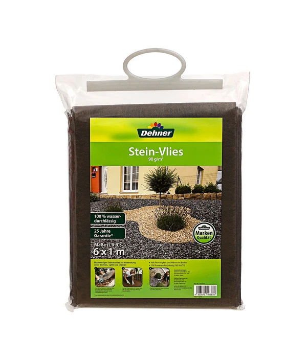 Sie erhalten das Dehner Stein-Vlies in 100 x 600 cm. Damit lässt sich einiges erreichen! Je nachdem wie Ihre Beetmaße sich ausnehmen, können Sie das Dehner Stein-Vlies auch zuschneiden und überlappend verlegen. Ist Ihr Beet größer, arbeiten Sie einfach mit mehreren Packungen Dehner Stein-Vlies. Für Pflanzöffnungen machen Sie einen kreuzförmigen Schnitt, legen das Vlies danach bis an die Pflanze heran und beginnen dann mit dem Kies. Folgen Sie einfach der Anweisung auf der Verpackung. Dann werden Sie schon bald mit einem eindrucksvollen Ergebnis belohnt.