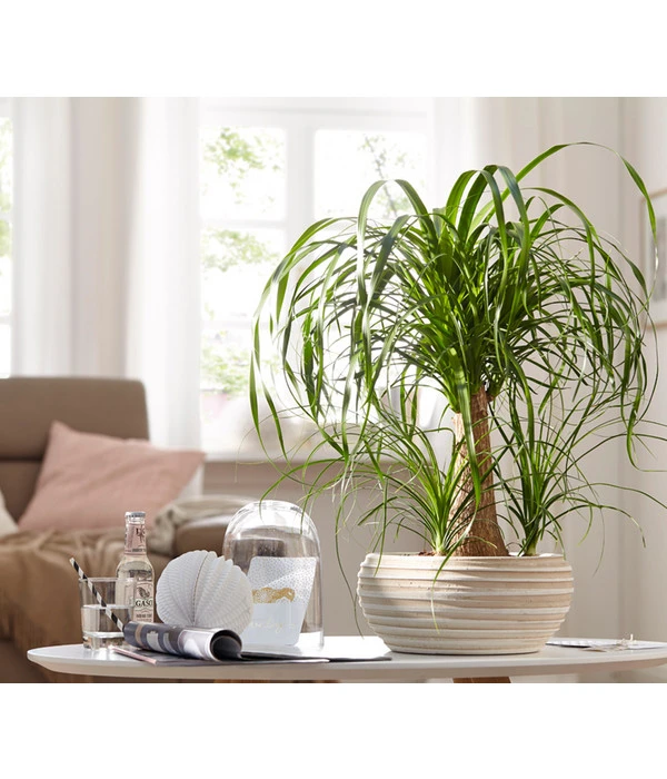 Der Elefantenfuß ist eine äußerst robuste Zimmerpflanze, die ursprünglich aus Mexiko stammt. Der Name kommt nicht von ungefähr, denn beim ersten Anblick wird klar – der Stamm dieser Pflanze erinnert an den Fuß eines Dickhäuters. Mit etwas Phantasie lässt sich sogar die Zweitbenennung ‚Flaschenbaum‘ ableiten In seinem Stamm speichert der Elefantenfuß Wasser und kann so lange Trockenperioden überstehen. An der Spitze des Stammes bildet sich eine Blattkrone mit langen, schmalen und gebogenen Blättern, die eine Länge von bis zu einen Meter erreichen können. Dekorativ begleitet von drei kleinen Triebe, sitzt dieser Elefantenfuß in hochwertiger Keramik und verbreitet ein tropisches Flair in Ihrem Zuhause.