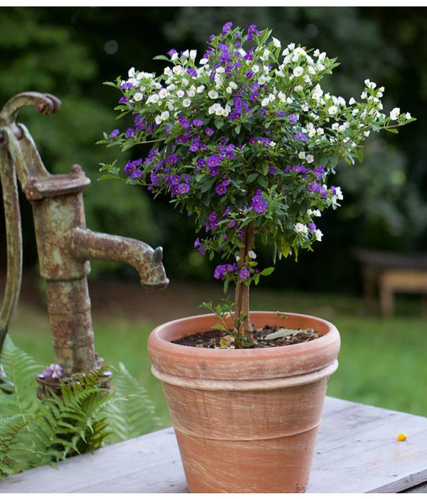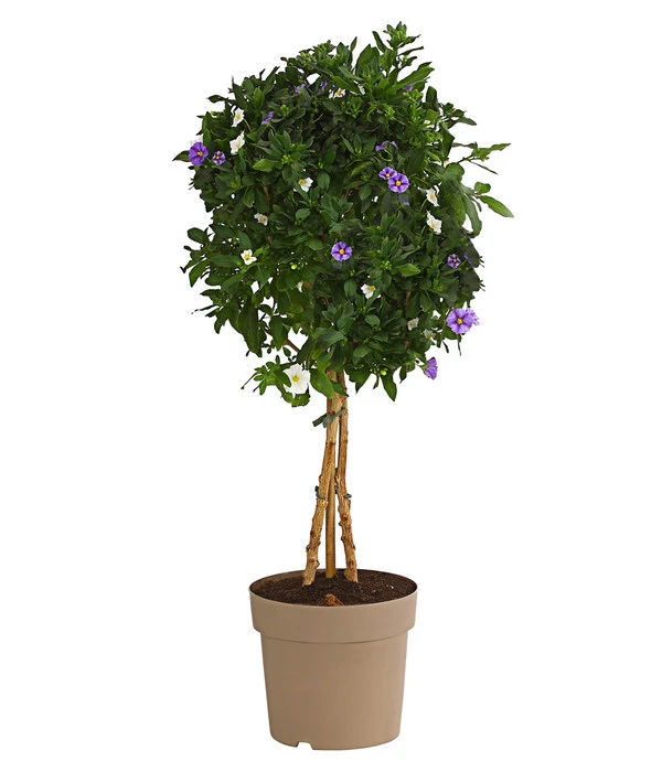 Der aus Südamerika stammende Enzianstrauch, gehört genauso wie die Kartoffel zu der Familie der Nachtschattengewächse. Deshalb ist er hierzulande auch oftmals unter Namen Kartoffelstrauch bekannt. Seine weiß-blaue Blütenpracht erfreut das Auge von April bis Oktober mit unzähligen Blüten. Das Stämmchen verzaubert jeden Sitzplatz auf Balkon oder Terrasse, ausgepflanzt im Garten geht natürlich auch, bedenken Sie aber dass die Pflanze nicht winterhart ist und somit jedes Jahr neu ausgepflanzt werden muss.