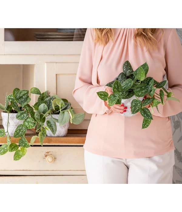 Auch Pflanzenprofis haben es oft schwer Zimmerpflanzen voneinander zu unterscheiden. So werden viele denken die Gefleckte Efeutute ‚Pictus‘ sei der Gattung Epipremnum zugeordnet und somit mit der klassischen Efeutute verwandt. Doch auch wenn sich die Pflanzen in Bezug auf Name, Pflege und Blattform stark ähneln und auch zur selben Familie sowie aus derselben Heimat stammen, ist die Gefleckte Efeutute den Scindapsus zugeordnet. Äußerliche unterscheiden lässt sich die Gefleckte Efeutute von den ledrigen, mattgrünen Blättern, die mit silbrigen Flecken übersät sind. Bei bei dieser Grünpflanze handelt es sich um eine Rank- und Kletterpflanze, weswegen ihre dekorativen Blätter und die langen Ranken in der Ampel besonders schön zur Geltung kommen.