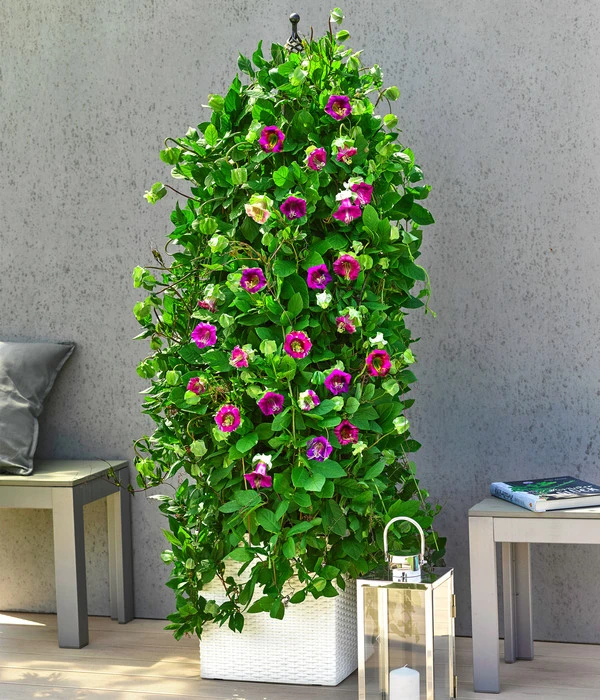 Der anspruchslose, fleißige Kletterer erobert an Spalieren Hauswände und hohe Zäune im Nu und bietet daher einen einjährigen, reich blühenden Sichtschutz. Auf Balkon oder Terrasse – im Kübel gepflanzt können Sie die Glockenrebe sogar mobil werden lassen. Stellen Sie den Topf einfach auf einen Rolluntersetzer. Ohne Mühe können Sie Ihren flexiblen Sichtschutz nun an die gewünschte Position befördern. Eine Kletterhilfe, an der die Pflanzen Halt finden, ist jedoch frühzeitig anzubringen, damit die Glockenrebe ihre Wuchslänge voll zur Geltung bringen kann.