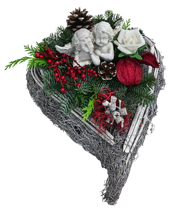 Mit diesem Rebenherz ist unseren Floristen ein ganz besonderer Grabschmuck gelungen. Kann man seine Trauer, seine unvergängliche Liebe und der Wunsch nach einem Wiedersehen in der Ewigkeit liebenswerter ausdrücken als mit diesem Rebenherz? Das Bukett wurde von erfahrener Hand auf einem Bett aus verschiedenen Koniferen arrangiert und dezent mit kleinen Zapfen und anderen getrockneten Dekoelementen ergänzt. Das Besondere sind aber auch die beiden Engel die über die Grabstätte wachen. Stellen Sie sich vor, wie schön es sein wird, wenn Sie an Allerheiligen oder am Totensonntag – vielleicht im Kreise anderer Angehöriger – gemeinsam auf den Friedhof gehen und das Rebenherz auf das Grab legen, als lieben Gruß an den Verstorbenen.
