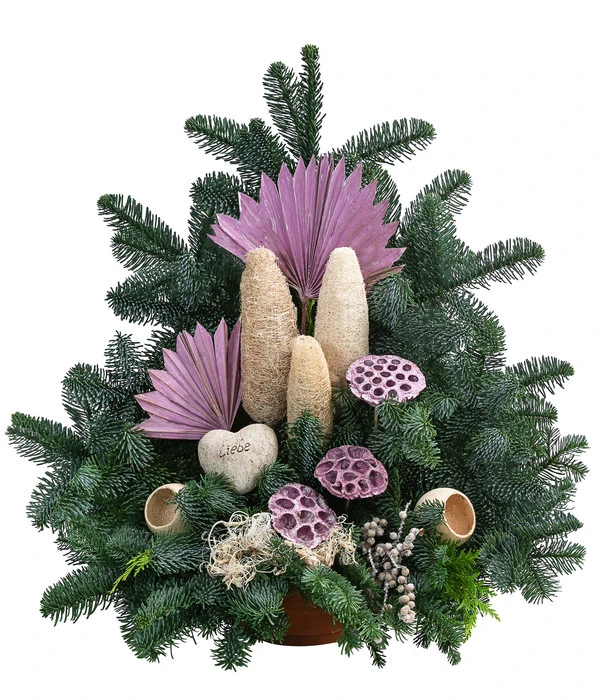 Lieben Sie es, die letzte Ruhestätte Ihrer Verstorbenen stilvoll zu gestalten? Dieses dreieckige Grabgesteck in Terrakotta-Schale ist eine handgearbeitete Meisterleistung aus dem Hause Dehner, die von erfahrenen Floristen aus frischen Tannen- und Koniferenzweigen mit Sorgfalt zusammengebunden wurde. Hochwertige Naturmaterialien in dezenten Farbtönen schmücken kunstvoll das üppige Tannengrün und verleihen der Kreation eine besonders edle Wirkung. Setzen Sie ein Zeichen der Liebe und Wertschätzung und ehren Sie Ihre Lieben mit diesem eleganten Gesteck, das seine Schönheit den ganzen Winter lang behalten wird.