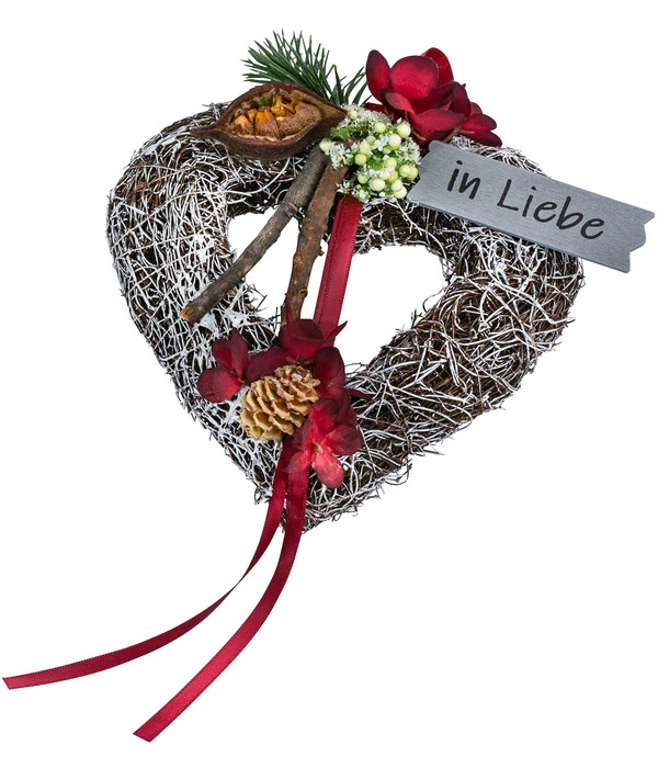 Wenn im November Allerheiligen, Allerseelen und der Totensonntag nahen, wünschen sich viele Menschen ein Grabgesteck, das ihre Verbundenheit zu den Verstorbenen ausdrückt und zugleich schön aussieht. Mit einem klassischen Gesteck ist es da oft nicht getan, die Floristen haben sich beim Gesteck Salim daher etwas besonders Schönes ausgedacht. Liebevoll von Hand wurde das Kunstgesteck in Herzform aus Rebenzweigen gefertigt und mit einem kleinen Schild „in Liebe“ versehen. So können Sie ganzeinfach Gesten sprechen lassen, wo Worte Ihre Trauer und Zuneigung vielleicht nicht zum Ausdruck bringen können. Eine schöne Botschaft für jede Grabstätte, nicht nur zu den Gedenktagen der Toten.