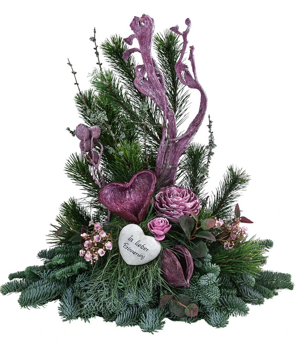 Wenn zu den Gedenktagen für unsere Toten im November die Gräber meist schon winterlich bepflanzt sind, ist es oft schwer, Gestecke zu finden, die auffallen. Viele kleinere Arrangements sind zwar stilvoll, gehen gerade bei Familiengräbern aber schnell unter. Das Grabgesteck Unvergessen wurde daher von Floristen besonders imposant gestaltet und von Hand gefertigt. Die vorherrschenden Farbtöne Lila und Grün passen sich harmonisch der Jahreszeit und dem Anlass an, sodass das Gesteck edel und dennoch auffällig wirkt. In der Mitte des Ensembles aus Nobilis, Bergkiefer, Blau-Schwingel und weiterer Dekoration liegt ein kleines Spruchherz aus wetterfestem Kunstharz. Neben ihm prachtvolle Holzblüten, Eukalyptus-Glocken und Badam-Schoten in Whitewah-Optik. Das Herzchen symbolisiert die ewige Liebe und passt dank seiner Farbe auch dauerhaft zu jedem Grab.