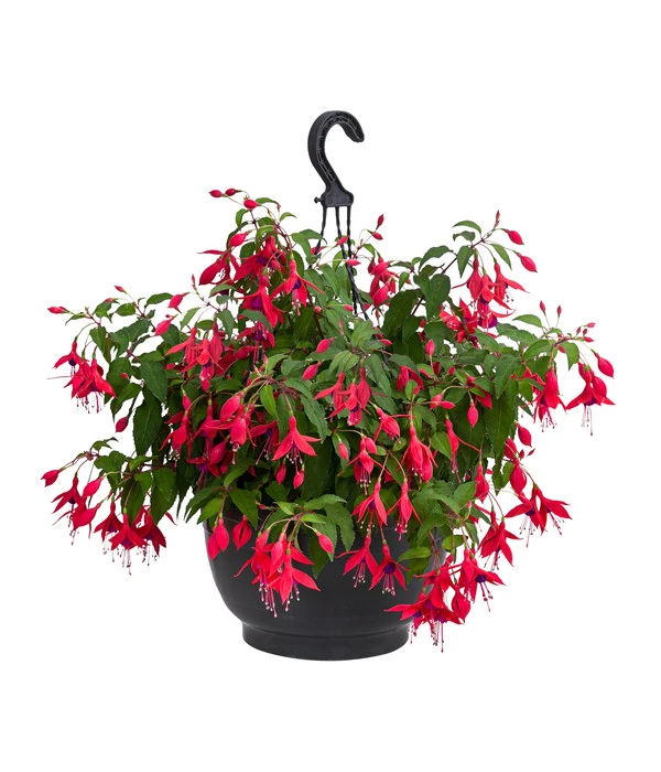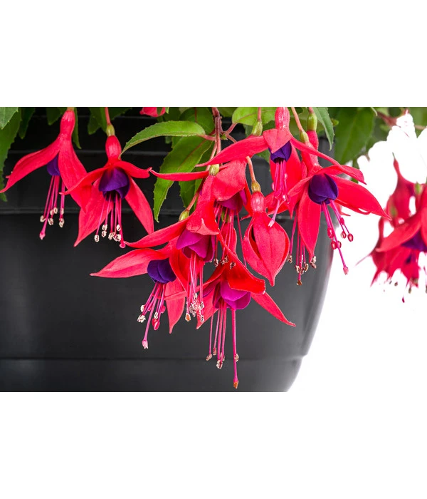 Die kunstvoll geformten Blüten-Glöckchen, die uns eine Fuchsie in verschiedenen leuchtenden Farben präsentieren kann, sind ihr auffälligstes Markenzeichen – und der Grund, warum sie zu den beliebtesten Balkonpflanzen gehört. Und ganz gleich, ob ihre Blüten einfarbig oder zweifarbig sind, ob sie einfach oder gefüllt blüht, jeder Blumenfreund kennt bei ihrem Anblick nur einen Wunsch: Die möchte ich haben! Wenn sich auch in Ihrem Inneren dieser Wunsch regt, haben Sie jetzt die Qual der Wahl. Suchen Sie sich gleich Ihre Favoriten aus und wenig später strahlen Sie die farbenfrohen Blüten der Hängefuchsie bereits von verschiedenen Stellen rund ums Haus an. Denn wir haben Ihnen die Pflanzarbeit abgenommen und bereits zwei verschiedene Farben in Hängeampeln gesetzt. Sie müssen nur noch die Ampeln aufhängen und können dann ganz entspannt die Blütenpracht der Hängefuchsien von Mai bis Oktober genießen.