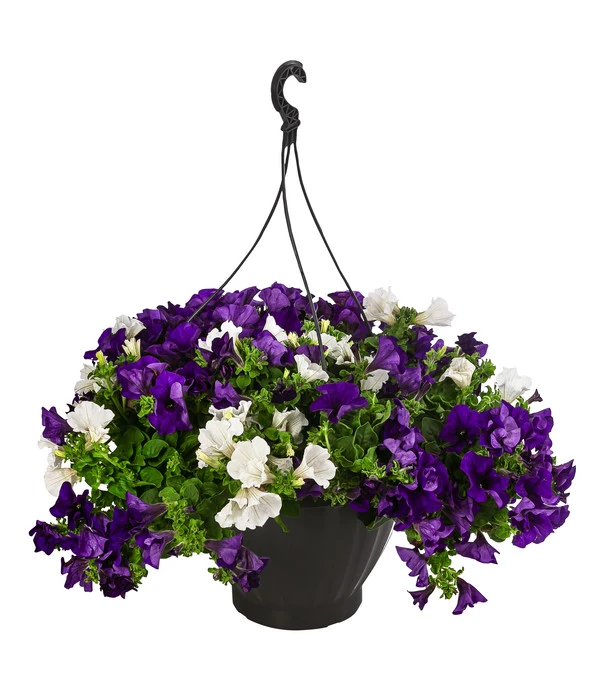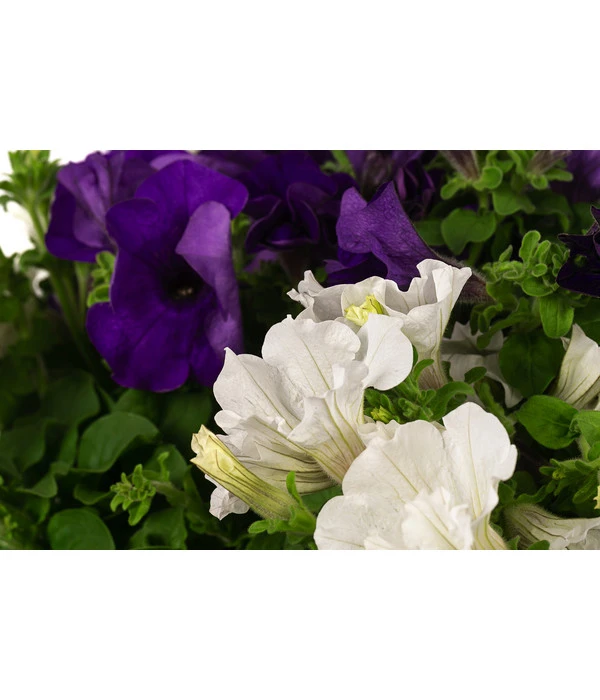 Ein Sommer ohne Petunien? Für die Fans der farbenfrohen Südamerikanerin undenkbar! Und tatsächlich gibt es kaum eine Sommerblume, die eine Petunie in puncto Blütenreichtum und Leuchtkraft übertrumpfen kann. Die mittelgroßen Trichterblüten leuchten in Weiß und Lila. Und weil dieses Farbenfeuerwerk Hand in Hand geht mit einer schier unglaublichen Blütenfülle, gehören Petunien bestimmt auch zu Ihren Favoriten, wenn’s um sommerlichen Blumenschmuck für Balkon und Terrasse machen. Sie suchen eine Petunie, die ihre langen, dicht an dicht mit Blüten besetzten Triebe malerisch über den Rand einer Ampel hängen lässt? Dann ist diese Hängepetunie genau die Richtige für Sie. Wir haben sie bereits in eine Ampel gepflanzt, so dass Ihr hängender Blumenschmuck mit einem Handgriff arrangiert ist. Greifen Sie gleich zu und genießen Sie den ganzen Sommer über die farbenfroh leuchtenden Blütenkaskaden dieser Hängepetunie!