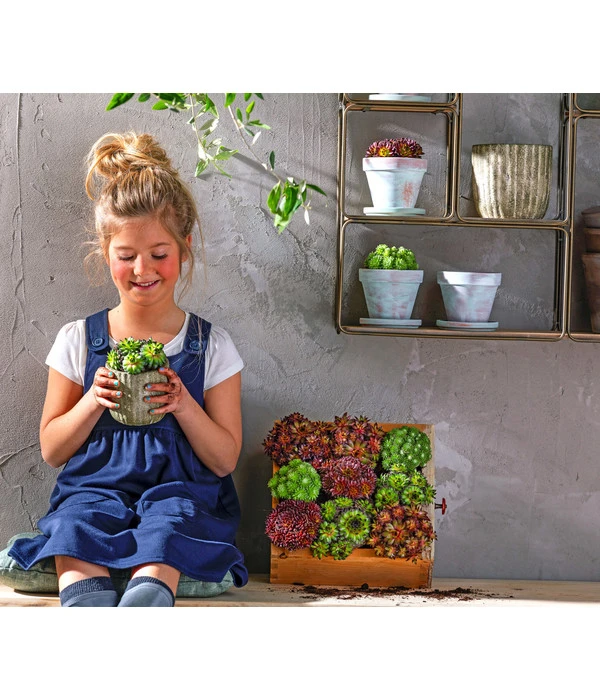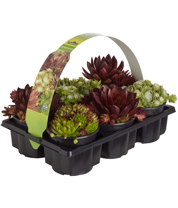An aparten Sukkulenten kommt im Moment niemand vorbei, der Wert auf eine trendige Wohnraumbegrünung legt. Wussten Sie aber, dass es unter den skurrilen Dickblattgewächsen sogar Sorten gibt, die ihr Leben lieber unter freiem Himmel verbringen? Und die sich dabei so anspruchslos gebärden wie kaum eine andere Gartenpflanze. Typisch für die Hauswurz ist die rosettenförmige Anordnung der immergrünen, dickfleischigen Blätter, die aufgrund ihrer verkürzten Sprossachse mit 10 – 20 cm nah am Boden bleiben. Doch so wenig Ehrgeiz die Pflanze in puncto Größenwachstum zeigt, legt sie sich voll ins Zeug, um Sie mit der Vielfalt ihrer Blattformen und -farben in ihren Bann zu ziehen. Sind diese bei einer Sorte glatt und glänzend, sind sie bei einer anderen mit spinnwebartigen Fäden geschmückt. Auch die Farbvielfalt der Hauswurze ist einfach überwältigend. Von sattem Grün über Graugrün bis zu Rotbraun reicht die Palette, manche Pflanzen haben sich sogar gleich mit mehreren Farben herausgeputzt. Verzichten Sie nicht auf diese extravaganten Pflanzen und holen Sie sich gleich die Hauswurz im 6er Tray!