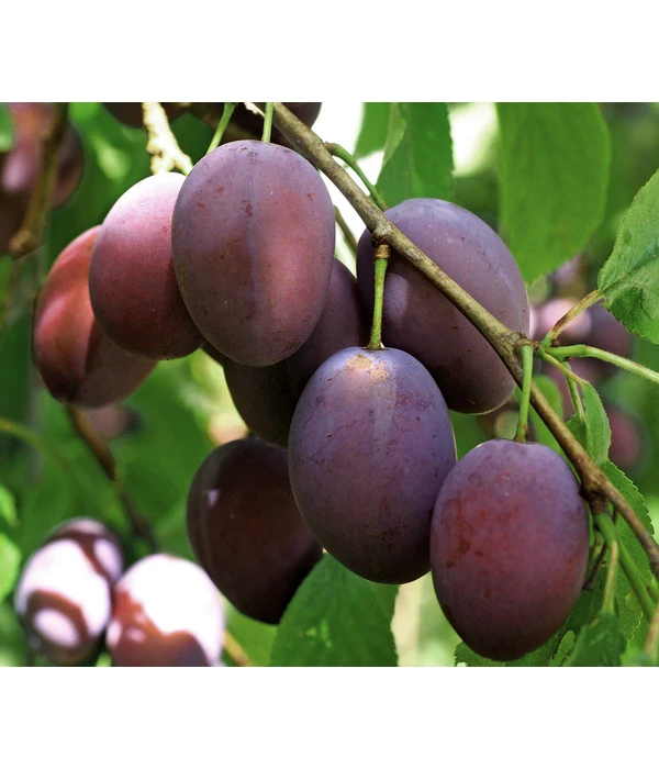 Mit dieser Zwetschge holen Sie sich eine altbekannte Sorte in den Garten. Da die Hauszwetschge so weit verbreitet ist, kennt sie jeder. Und wer liebt sie nicht, die kleinen dunkelvioletten Früchte? Sie überzeugen mit ihrem saftigen Fruchtfleisch, das in gelb und orange Tönen leuchtet. Der Geschmack ist süß mit einer leicht würzigen Note. Es handelt sich um eine sehr wertvolle, spät tragende Sorte. Der Stamm des Baums ist eher klein und besitzt eine hohe Krone. Die Blüten strahlen in grünweiß und gelbgrünen Tönen ab Mitte Mai. Da die Pflanze zu den Selbstbefruchtern gehört, ist keine zweite Befruchterpflanze nötig. Sie kann also hervorragend als Solitärpflanze gehalten werden. Die Zwetschgen sind ideal für den Frischverzehr, aber auch zum Backen und Kochen geeignet.