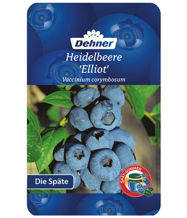 Heidelbeeren sind eine beliebte Obstsorte für Groß und Klein. Daher sollte für diese Beerensträucher in jedem Garten ein Plätzchen sein. Selbst auf dem Balkon in großen Gefäßen lassen sich Heidelbeeren anbauen. Daher sind in den letzten Jahren Kultur-Heidelbeersorten für eigenen Garten immer beliebter geworden. Neben dem guten Geschmack ist die vielseitige Verwendbarkeit von Heidelbeeren ein großer Pluspunkt der Beerensträucher. Heidelbeeren können eingefroren, getrocknet oder zu Marmelade und Saft verarbeitet werden. Auch frisch als Kuchenbelag oder für Obstsalate sind sie ein Genuss. Die Heidelbeere ‚Elliot‘ ist eine spättragende Sorte, ihre Erntezeit liegt im September. Dementsprechend spät blühen die Sträucher auch, weshalb Fröste der Blüte nicht schaden können. ‚Elliot‘ trägt kleinere himmelblaue Früchte, die sehr aromatisch schmecken.