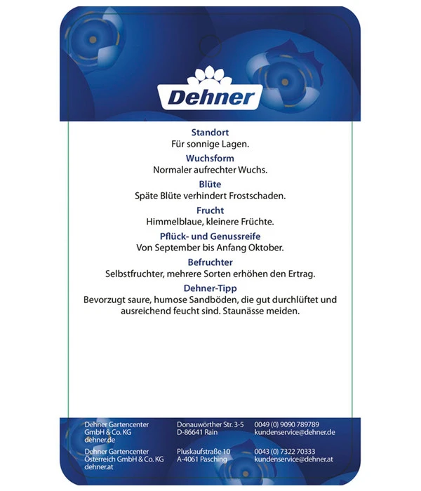 Heidelbeeren pflanzen Sie am besten an einen vollsonnigen bis halbschattigen Standort. Sie können sowohl im Beet als auch in großen Gefäßen kultiviert werden. Das Substrat sollte humos und sauer sein, daher empfehlen wir zum Einpflanzen Dehner Rhododendronerde. Ihr Nährstoffbedarf ist relativ hoch, eine regelmäßige Düngung, z.B. mit Dehner Beerendünger sorgt für gesundes Wachstum und reiche Erträge. Zwar sind Heidelbeeren selbstfruchtbar, dennoch wirkt sich die Pflanzung verschiedener Sorten positiv auf den Ernteertrag aus.