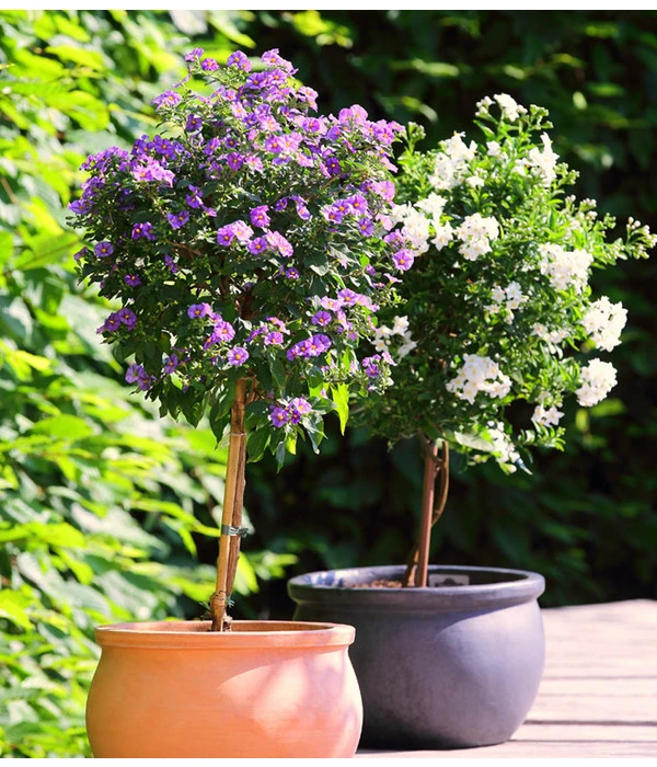 Der Jasminblütige Nachtschatten gehört der gleichnamigen Pflanzenfamilie der Nachtschattengewächse an. Lassen Sie sich von den Namen ‚Jasmin‘ nicht in die Irre führen, der Sommerjasmin hat nichts mit einem Jasmin oder gar dem Falschen Jasmin gemein, vielmehr trägt er seinen Namen aufgrund der schneeweißen Blüten, die in Größe und Form dem Jasmin unheimlich ähneln. Hierzulande gilt das Nachtschattengewächs als blühfreudige, rankende Kübelpflanze, welches bis in den späten Herbst hinein seine sternförmigen Blüten in voller Pracht zeigt. Dabei ist sie in der Pflege völlig unkompliziert.