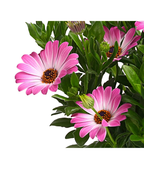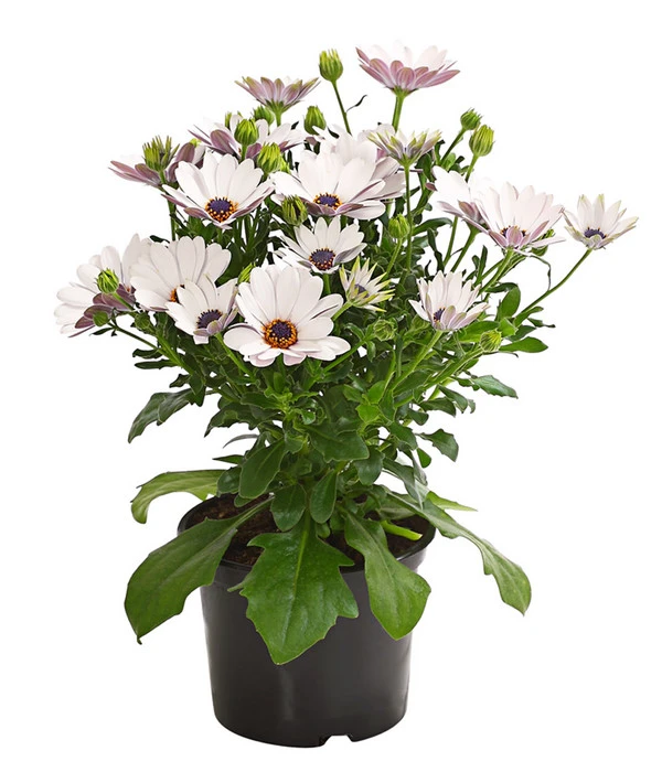 Suchen Sie auch immer wieder nach schönem Tischschmuck für Ihre Gartenparty? Gleichfarbige Kapkörbchen in einfachen Übertöpfen sind hübsche Hingucker. Darin halten sie es, bei etwas Fürsorge, auch tapfer aus, so lange die Gefäße nicht voll Wasser laufen. Mit ihrem kompakten, buschigen Wuchs passen Kapkörbchen sowohl in Beete als auch in Balkongefäße. Sie bestechen mit Einzelstellung, sind aber zudem ausgesprochen kombistark. Sie gesellen sich gerne zu Minihängepetunien, Geranien, zu Männertreu, Husarenknop und Vanilleblume. Gut geeignet sind die Osteospermum auch für Friedhöfe, auf dem Grab lenkt sie mit ihren heiteren Margeritenblüten die Gedanken in lichtere Bahnen.