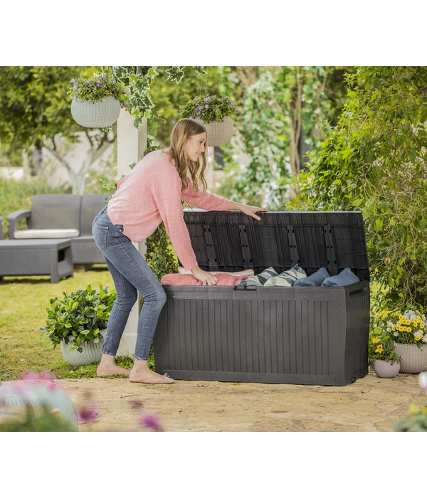 Mit der Keter Aufbewahrungsbox Comfy haben Sie nicht nur einen optisch ansprechenden und zugleich wettergeschützten Ort zum Aufbewahren Ihrer Gartenpolster. Der Deckel der Box ist nämlich so stabil konstruiert, dass er mit einem Gewicht bis zu 220 kg belastet werden kann. Und was liegt da näher als die Box auch als zusätzliche Sitzgelegenheit für zwei Erwachsene zu nutzen! Dieses Ausstattungsdetail ist besonders auf Balkonen und Terrassen willkommen, die schon üppig möbliert sind, so dass keine zusätzlichen Sitzmöbel mehr Platz haben.