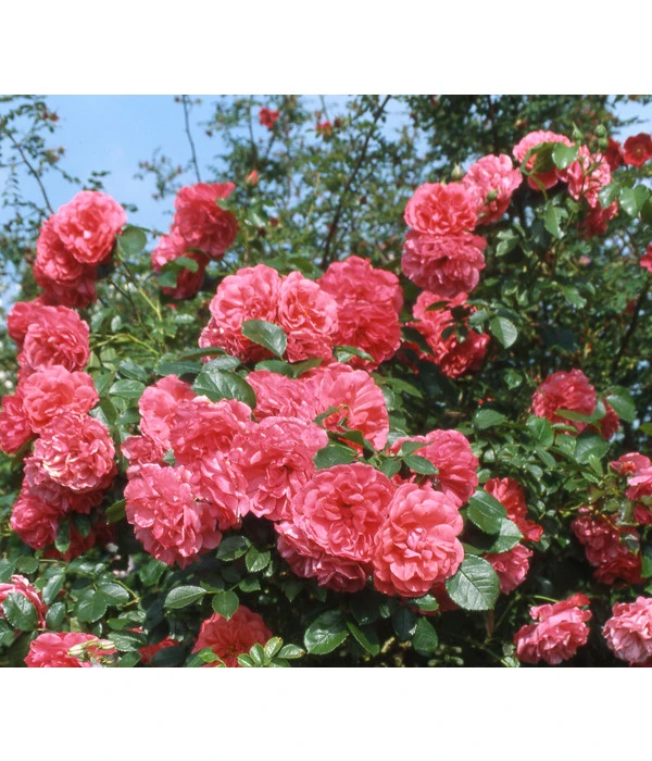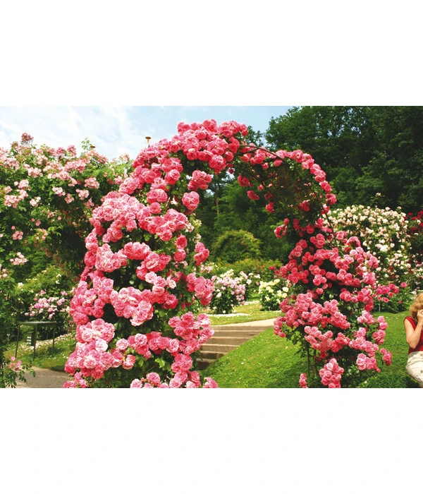 Eine in voller Blüte stehende Kletterrose ist für viele der Inbegriff von Romantik. Die Königin der Blumen klettert an Hauswänden und Pergolen bis in Höhen von 3,50 m und bedeckt mit ihrem Blütenreichtum Rosenbögen und Zäune und kann so zum weithin sichtbaren Höhepunkt der Gartengestaltung werden. Wir bieten Ihnen hier verschiedene Sorten in unterschiedlichen Farbstellungen an. Alle Pflanzen zeigen eine sehr gute Verzweigung von unten an, wachsen aufrecht und breit und bilden viele, dunkelgrüne, ledrige Blätter, die den dekorativen Hintergrund für die dicht an dicht stehenden Blüten der Klettrosen bilden. An einem guten Rosenstandort und bei fachgerechter Pflege gedeihen Kletterrosen übrigens auch in großen Pflanzkübeln prächtig, sodass sich auch Balkongärtner an ihrem Blütenflor erfreuen können.