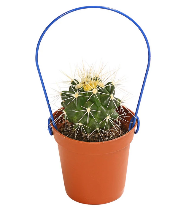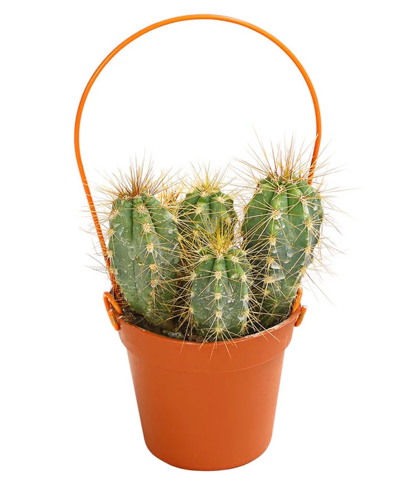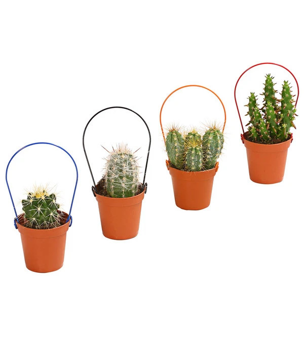 Die Vielfalt der Wuchsformen ist fantastisch, finden Sie nicht auch? Knubbelig oder aufrecht wachsend, solo oder mit zahlreichen Nebensprossen und natürlich mit mehr oder weniger gefährlichen Stacheln „bewaffnet“. Und dann haben wir noch gar nicht die tollen Blüten erwähnt, mit denen sich Kakteen schmücken können, wenn sie sich wohl fühlen. Kein Wunder, dass es im Moment einen richtigen Boom um die stacheligen Gesellen gibt, von dem auch Sie sich ruhig anstecken lassen dürfen. Denn Kakteen sind nicht nur ein kurzfristiger Deko-Trend, so manch einer hat auf diesem Wege schon sein Herz an die unkomplizierten Wüstenbewohner verloren und es wurde eine Wohngemeinschaft auf Lebenszeit. Besonders faszinierend wirken diese Pflanzen aber, wenn sie sozusagen noch in den Kinderschuhen stecken. Deshalb bieten wir Ihnen hier einen Mix aus verschiedenen Mini Kakteen, die neben eigenwilligem Wuchs und Stacheln eines gemeinsam haben: sie stecken in einem Topf mit Bügel. Tragen Sie gleich mehrere Mini Kakteen am Bügel nach Hause, denn je zahlreicher die Gesellschaft ist, die Sie um sich versammeln, umso beeindruckender ist die Deko-Wirkung!