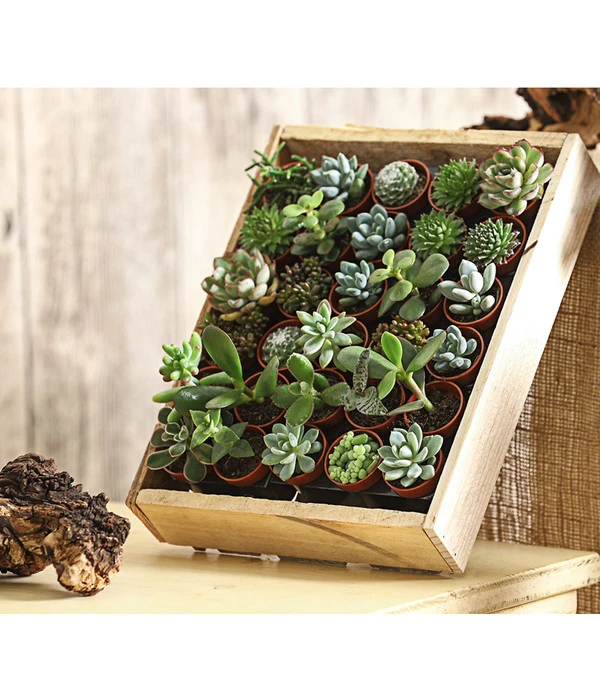Wer sich in der Pflanzenwelt kundig macht, wird überrascht sein, wenn er auf die Sukkulenten stößt. Nicht nur aufgrund ihrer unterschiedlichen, bizarren Optik, sondern auch aufgrund ihrer erstaunlichen Überlebensfähigkeiten, die diese Pflanzen im Laufe der Jahre entwickelt haben, um in ihrem natürlichen Lebensraum zu überleben. Mit der Fähigkeit Wasser in ihrem Gewebe für Notzeiten zu speichern, sind sie gut an die oft besondere Klima- und Bodenverhältnisse angepasst und deshalb auch in unseren Breiten so beliebt. Denn wer gerne das Gießen seiner grünen Schätze vergisst, greift gerne zu den pflegeleichten Sukkulenten. Dabei bilden die Sukkulenten keine eigenständige Familie, es werden Arten aus vielen, unterschiedlichen Pflanzfamilien, die nicht miteinander verwandt sind, darunter zusammengefasst. 30 dieser Mini-Sukkulenten haben wir für Sie ausgesucht und zusammen in diese Holzkiste verpackt, darunter sind unter anderem Sorten wie Echeverien, Geldbäume oder unterschiedliche Aloe-Arten.
