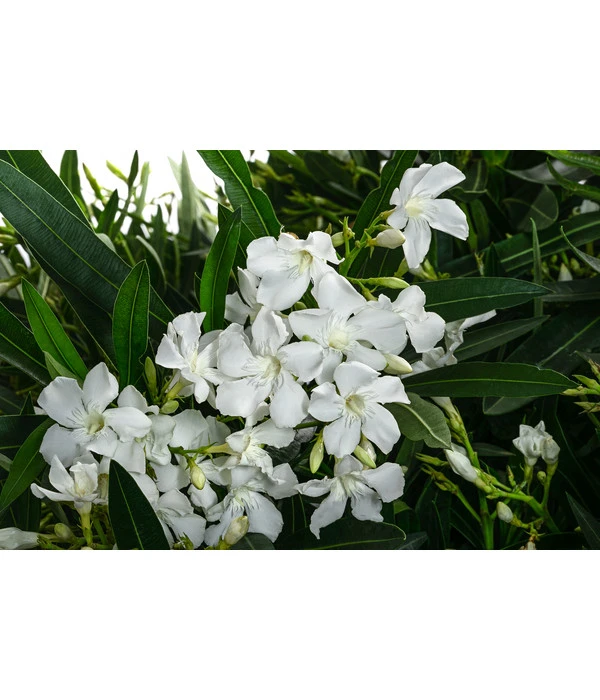 Standardpflanzen für die Terrasse, den Balkon oder den Eingangsbereich sind Ihnen zu langweilig und nicht spektakulär genug? Dann wird es höchste Zeit für einen Oleander. Der überaus attraktive Busch kommt schon in einer beachtlichen Wuchshöhe zu Ihnen und wird daher von vorne herein für neidische und bewundernde Blicke sorgen. Neben dem üppigen, dichten Wuchs überzeugen aber natürlich hauptsächlich die Blüten Ihrer neuen Kübelpflanze. Denn der Oleander blüht ausdauernd zwischen Mai und Oktober und verschönert damit die gesamte Gartensaison. Und da diese Kübelpflanze mit Ihren Reizen nicht geizt, ist ein Oleander gleich mit Dutzenden schöner Blüten übersät. Wenn Sie dieses Blütenmeer verlängern möchten, sollten Sie Ihre Pflanze öfter während des Jahres zurückschneiden. Als Belohnung verbreitet der Oleander-Busch dann mediterranes Urlaubsfeeling und verwandelt Ihren Außenbereich in eine wahre Ruheoase.