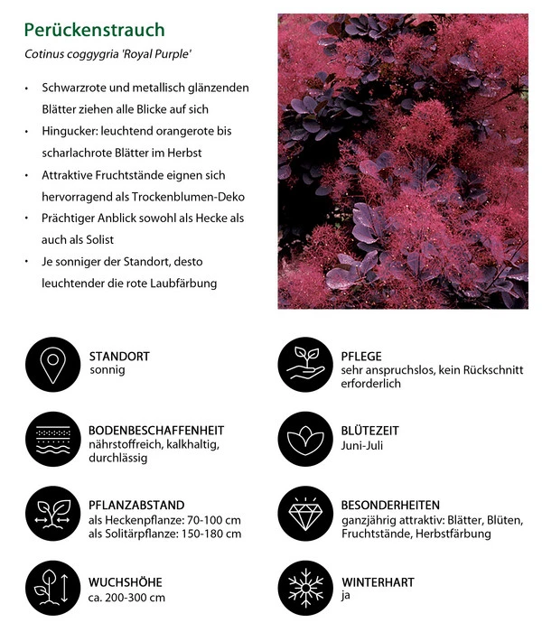 Schon wegen seiner auffallend schwarzroten, metallisch glänzenden Blätter hat der Perückenstrauch ‚Royal Purple‘ viele Fans. Doch der Klassiker der Cotinus-Sorten kann noch mehr, und zeigt sich im Jahresverlauf als wahrer Verwandlungskünstler, der immer wieder eine neue Attraktion zu bieten hat. Im Juni und Juli erscheinen an den Trieb-Enden zunächst duftige, gelblich-rote, 15 – 20 cm lange Blütenrispen. Ab Frühsommer kann man die silbrig-rötlichen, perückenartigen Fruchtstände bewundern. Sie entstehen aus den seidig-fedrig behaarten Stielen der unfruchtbaren Blüten und gaben diesem spektakulären Strauch seinen Namen. Zum großen Finale im Herbst färben sich die schwarzroten Blätter leuchtend orangerot bis scharlachrot und erfreuen noch lange im tristen Herbst als farbigenfroher Blickfang.
