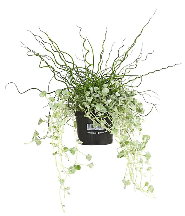 Man weiß gar nicht, welcher der beiden Pflanzen man mehr bewundern soll. Die Augen wandern fasziniert zwischen diesen zwei Blattschmuckpflanzen hin und her, was schon ein sicheres Zeichen für die tolle Wirkung dieser Mixtur ist. Denn wenn es Ihnen jetzt so geht, wird es auch Ihrer Familie, Ihren Nachbarn und Gästen ergehen, wenn sich die Dichondra und die Juncus in einer Blumenampel oder einem Balkonkasten präsentieren. Die Dichondra, auch Silberregen genannt, hat ihre Heimat in den Tropen und Subtropen und setzt sich mit langen, silbrig belaubten Trieben in Szene, die sie effektvoll aus Ampeln und Kästen herausfallen lässt. Dazu wurde der Juncus kombiniert, deren grüne Zweige aussehen wie verdrehter Schnittlauch und die ihr den hübschen Namen Liebeslocken eingebracht haben. Sie werden immer wieder aufs Neue begeistert sein von der aufregenden Erscheinung dieser zwei optisch so unterschiedlichen Blattschönheiten.