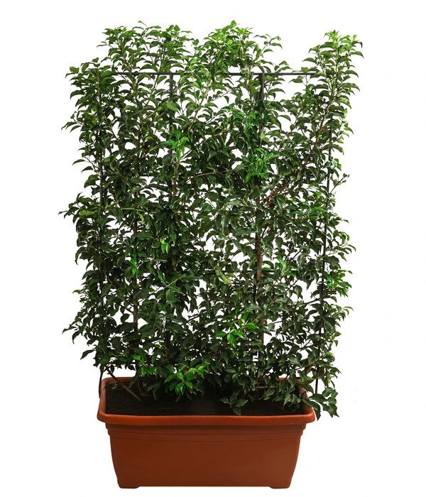 Ein stolz aufrechter Wuchs und dazu ein dichtes, glänzend dunkelgrünes Laubkleid, das in seiner Form und Größe an den echten Lorbeer erinnert – ein Portugiesischer Kirschlorbeer ‚Brenelia‘ ist unbestreitbar der Star unter den Lorbeerkirschen und macht der normalen Kirschlorbeerpflanze heftige Konkurrenz. Denn seine Eleganz geht nicht auf Kosten der anderen guten Eigenschaften wie Robustheit, Wuchsfreude, Winterhärte und noch einige mehr. Und so prachtvoll sich Prunus lusitanica als Solitär in einer Gartenanlage macht, so gerne bildet er zusammen mit einigen Kollegen eine blickdichte, immergrüne Sichtschutzhecke. Ein solch eingespieltes Team können wir Ihnen hier vorstellen, das seit einiger Zeit am Spalier wächst und bereits eine Höhe von 170 cm erreicht hat. So kann Sie das Ziergehölz fast vom ersten Moment an vor neugierigen Blicken, aber auch vor unangenehmem Wind und Lärm schützen. Lassen Sie bald Portugiesischer Kirschlorbeer ‚Brenelia‘ bei Ihnen einziehen und freuen sich jetzt schon aufs nächste Frühjahr, wenn der kräftige Neuaustrieb in leuchtendem Rot einen dekorativen Kontrast zu dem dunklen Grün setzt.