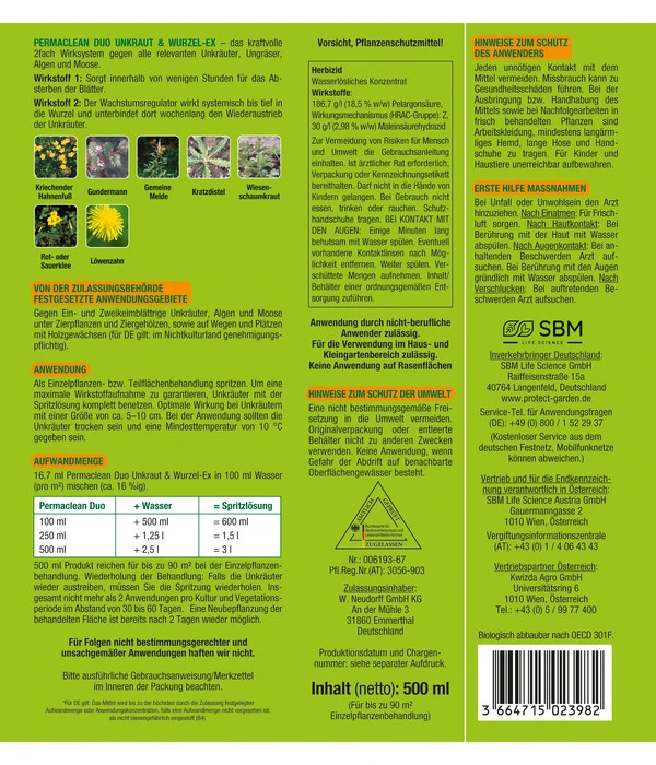 PROTECT GARDEN Permaclean Duo Unkraut & Wurzel-Ex entfaltet seine Wirkung gegen alle relevanten Unkräuter, Ungräser, Algen und Moose. Das sind zum Beispiel Kriechender Hahnenfuß, Gundermann, Gemeine Melde, Kratzdistel Wiesenschaumkraut, Rot- und Sauerklee und Löwenzahn. Das Besondere an PROTECT GARDEN Permaclean Duo Unkraut & Wurzel-Ex ist das perfekte Zusammenspiel der beiden Wirkstoffe. Wirkstoff 1: Sorgt in wenigen Stunden für das Absterben der Blätter. Wirkstoff 2: Wirkt bis tief in die Wurzel und unterbindet so wochenlang den Wiederaustrieb.