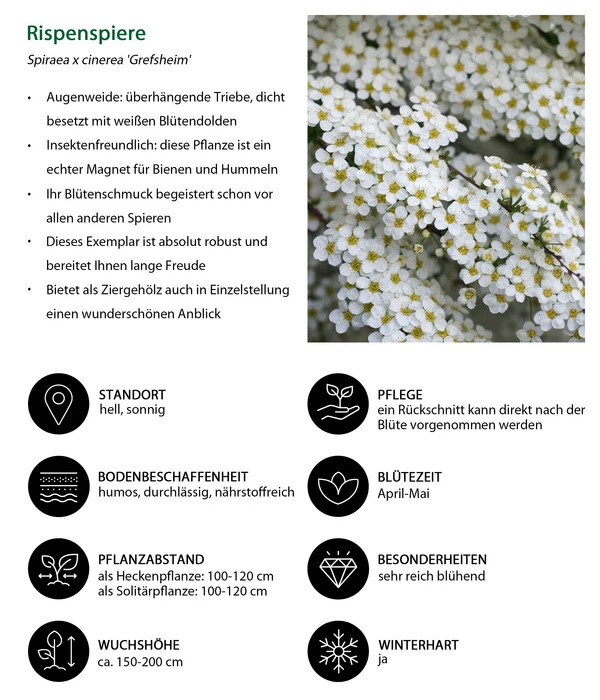 Wenn sich im April eine Spiere im vollen Schmuck ihrer schneeweißen Blütenrispen präsentiert und dabei die Triebe elegant überhängen lässt, wird jeder von diesem malerischen Anblick fasziniert sein. Spieren gehören zu den beliebtesten Pflanzen in Privatgärten wie in Parkanlagen, denn das Ziergehölz weiß einen überreichen Blütenschmuck mit einem völlig unkomplizierten, robusten Wesen zu verbinden. Die Weiße Rispenspiere ‚Grefsheim‘ gehört zu den besonders früh blühenden Spieren, was ihr eine Sonderstellung innerhalb der Spieren einräumt. Das Blühgehölz zeigt einen lockeren Wuchs und wird schnell zu einem dichtbuschigen Strauch heranwachsen, der eine Höhe von 150 – 200 cm erreichen wird. Und noch jemand wird sich über die reichblühende Weiße Rispenspiere ‚Grefsheim‘ in Ihrem Garten freuen: Schnell wird es sich unter Biene und Co herumsprechen, dass bei Ihnen eine Fülle köstlicher Blüten locken, von denen die Nutzinsekten mit Begeisterung täglich naschen werden.