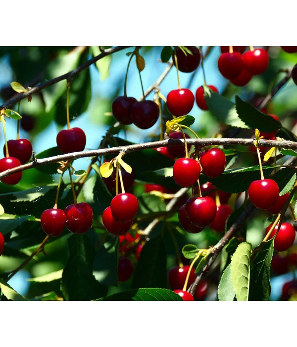 Beim Frischverzehr von Sauerkirschen scheiden sich die Geister: die einen verziehen beim Probieren der sauren Kirschen erschrocken das Gesicht, andere werden zu einem glücklichen Strahlen veranlasst, wenn sie die reifen, saftigen, tief dunkelroten Früchte mit dem säuerlichen Aroma genießen. Einig sind sich beide Kirschenlager aber darin, dass es kaum eine bessere Sauerkirsche für die Verarbeitung zu feinen Konfitüren und Marmeladen, zur Saftgewinnung und Mostherstellung gibt als die ‘Schattenmorelle‘. Sauerkirschen zählen zu den Steinobstsorten und sind generell etwas starkwüchsiger als Kernobstarten. Bei Dehner finden Sie die Sauerkirsche ‘Schattenmorelle‘ als Busch oder Halbstamm, so dass Sie genau die Größe und Form wählen können, die am besten in Ihren Garten passt. Geerntet werden können die Kirschen in der Regel Ende Juli / Anfang August.