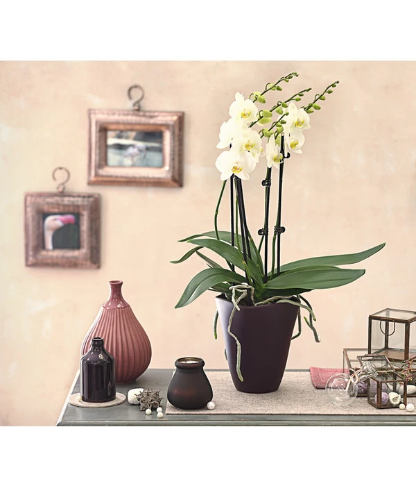 Arrangieren Sie die Schmetterlingsorchideen in farblich abgestimmten Übertöpfen und kombinieren Sie sie mit verschiedenen Blattschmuckpflanzen, wie z. B. Frauenhaarfarn.