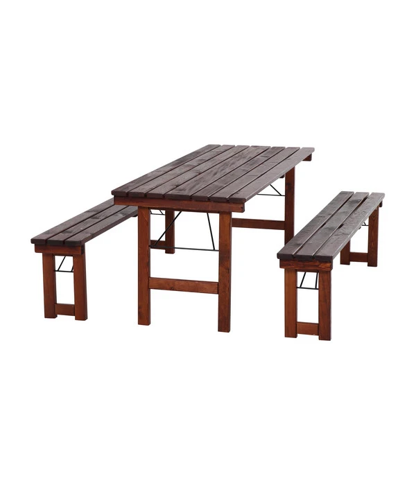 Was macht eigentlich die besondere Ausstrahlung der Sitzgarnitur Wallis aus? Es ist das rustikale Design. Sowohl Tisch als auch Bänke wurden bewusst einfach und in typischer Lattenoptik gestaltet. Aber das ist nicht alles. Der spezielle, urige Charme der Sitzgruppe entsteht durch die dunkle Lasur, mit der das Kiefernholz behandelt wurde. Dank ihrer Schlichtheit harmoniert die Garnitur mit den unterschiedlichsten Einrichtungsstilen und ist auf Terrasse, Balkon oder Garten eine Bereicherung.