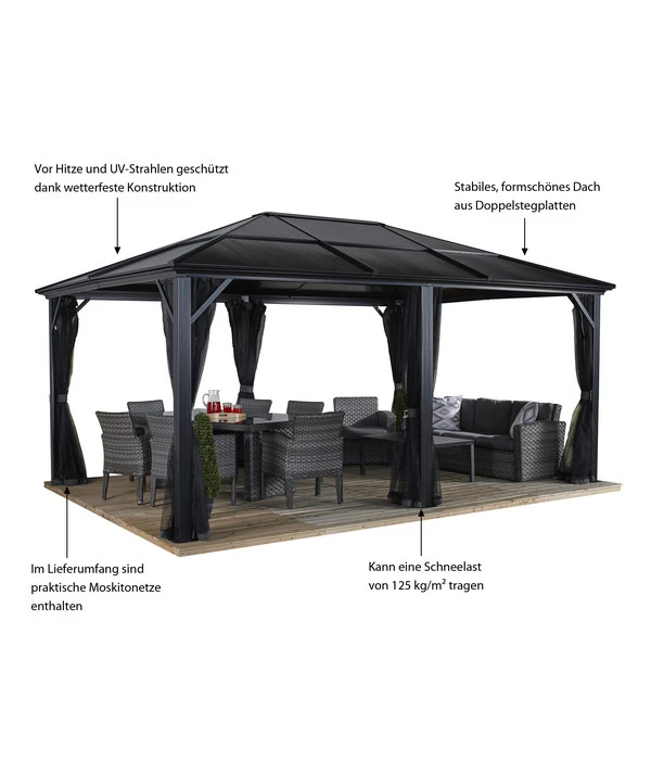 Vielleicht steht bei Ihnen eine große Feier ins Haus und Sie möchten auf Nummer sicher, dass sie nicht von schlechtem Wetter gestört wird? Oder haben Sie schon immer davon geträumt, sich einen Gartenpavillon anzuschaffen? Eine lauschige Oase, in der Sie an heißen, sonnigen Tagen vor Hitze und UV-Strahlen geschützt sind, während ein leiser Wind durch die offenen Wände streicht; und ein gemütlicher Ort, an dem Sie an kühlen Tagen einfach die Vorhänge an der Wetterseite zuziehen, so dass es drinnen angenehm temperiert bleibt. Der Sojag Pavillon Meridien bietet Ihnen tatsächlich einen Raum unter freiem Himmel, der sich flexibel Ihren Wünschen und der Wetterlage anpasst. Und bei seinen stattlichen Maßen passt auch eine größere Gesellschaft spielend unter das feste Dach. Erleben Sie bald vergnügliche und entspannte Stunden in Ihrem Sommersitz der Extraklasse: dem Sojag Pavillon Meridien!