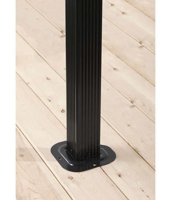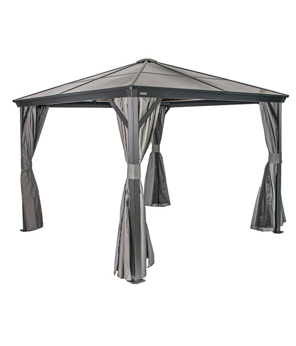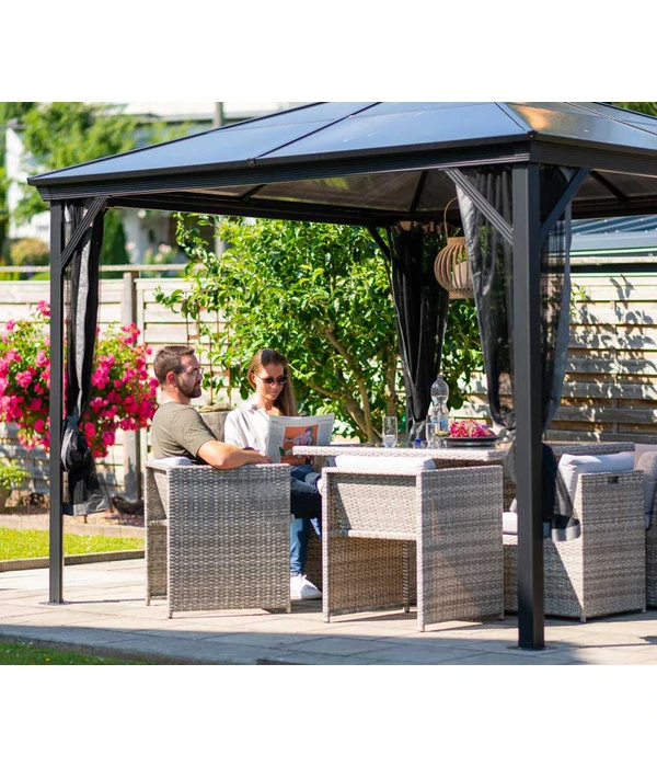 Der Sojag Pavillon Verona besteht aus einer stabilen Konstruktion aus hochwertigem, pulverbeschichtetem Aluminium mit einer Pfostenstärke von 7,6 cm, die ein solides Dach aus 6 mm starken Doppelstegplatten tragen. Das Dach ist absolut wasserdicht und hält starker UV-Strahlung wie auch Dauerregen problemlos Stand. Es kann sogar mit einer außergewöhnlichen Schneelast von 125 kg/m² überzeugen, so dass Sie Ihre Sommerresidenz über den Winter nicht abbauen müssen, sondern unbesorgt draußen stehen lassen können. Denn nicht nur beim Aluminium wurde auf dauerhafte Rostfreiheit geachtet, auch die Schrauben bestehen aus rostfreiem Edelstahl.