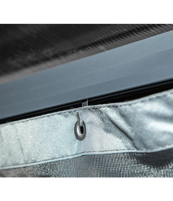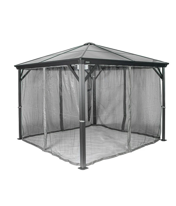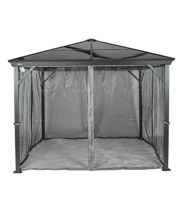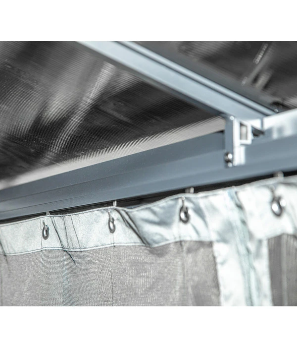 Im Lieferumfang zum Sojag Pavillon Verona sind nicht nur passende Moskitonetze enthalten, sondern auch zweigleisige Laufschienen, sodass Sie zusätzlich Vorhänge anbringen können. Diese sind in edlem Anthrazit als Zubehör erhältlich. Das Besondere an diesem Pavillonmodell: Sie können die Vorhänge und die Moskitonetze gleichzeitig benützen.