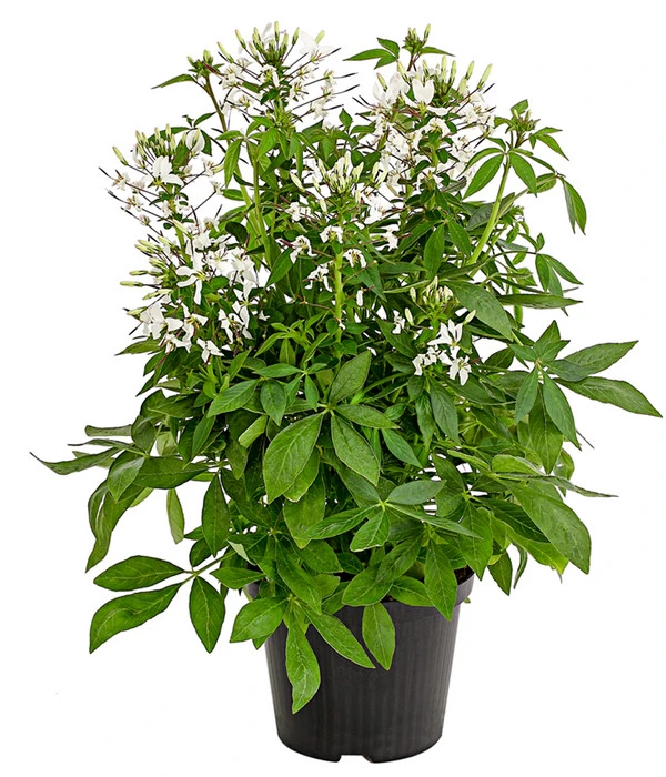 Setzen Sie in Ihrem Blumengarten auf die Spinnenpflanze ‚Weiß‘, die mit botanischem Namen auch Cleome heißt. Die Pflanze begeistert schon ab Mai mit aparten, spinnenartigen Blüten in strahlendem Weiß, die aus lang gestielten Blüten- und Staubblättern bestehen. Blüten-Kunstwerke, die bis in den Oktober hinein als krönender Schmuck über dem dunkelgrünen Laubwerk zu bewundern sind. Genau deshalb zählt die Cleome wohl auch zu den beliebtesten Gartenpflanzen. Dank ihrer unermüdlichen Blühfreude trägt die Spinnenpflanze ‚Weiß‘ bis zu den ersten Frösten stolz ihren filigranen Blütenschmuck. Die Pflanze wächst aufrecht, buschig und gut verzweigt. Mit einer Höhe von bis zu einem Meter ist die Cleome eine beeindruckende Erscheinung, die alle Blicke auf sich zieht.