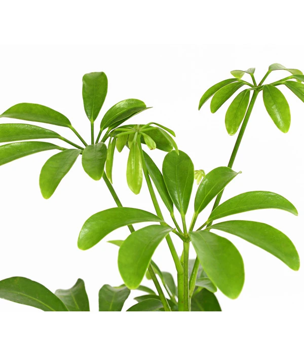 Die strahlenförmig angeordneten, dunkelgrünen Blätter mit der gelbgrünen Zeichnung sind das dekorative Pfund, mit dem die Schefflera wuchern kann. Und das tut sie üppig, denn sie streckt sich wuchsfreudig bis in eine Höhe von 180-200 cm, behält dabei aber ihren kompakten, buschigen Wuchs und ihr attraktives Blattkleid. Mit der Sternaralie, wie die Zimmerpflanze auch heißt, entscheiden Sie sich für einen echten Klassiker, der seine Persönlichkeit mit Vorliebe in Einzelstellung präsentiert. Unterstützen Sie die dekorative Raumwirkung der Pflanze noch mit einem stilvollen Übertopf, der in Form und Farbe mit Ihrem Wohninterieur harmoniert.