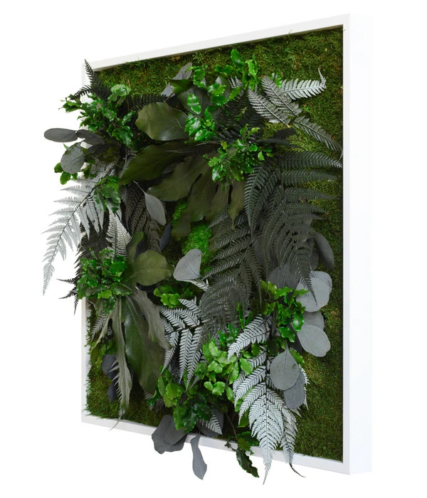 Die Moose und Blätter für das Bild im Dschungeldesign wurden in einem speziellen Verfahren konserviert, so dass sie zwar ihre natürliche Optik behalten haben, dass sie aber weder Wasser noch Licht brauchen. Und das bedeutet für Sie, dass dieses Pflanzenbild auch in einem dunklen Flur, an einer dem Licht abgewandten Wand wunderschön natürliche Akzente setzen kann.