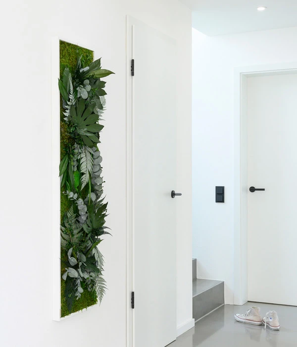 Mit einem Bild im Dschungeldesign entscheiden Sie sich für echte, aufwendig konservierte Pflanzen, in einem dezenten, weißen Rahmen aus FSC®-zertifiziertem Holz. Das Objekt benötigt keinerlei Pflege und sollte fern von Sonne, Lichtschein, Heizung und zu feuchter Luft hängen. Auf der Rahmenrückseite befindet sich eine Zackenaufhängung, mit der Sie es sowohl horizontal als auch hochkant hängen können – der Hit am Kopfende eines langen Flurs!