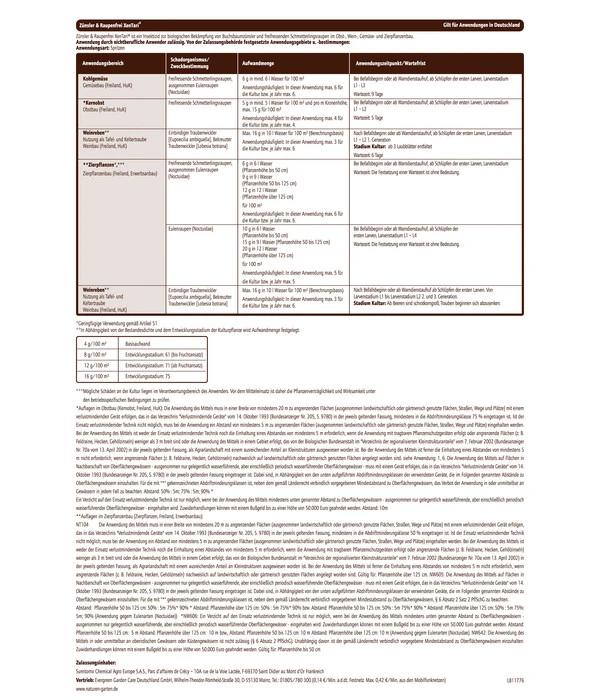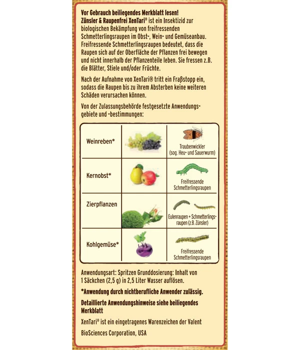 Substral® Naturen® Bio Zünsler & Raupenfrei Xen Tari® ist ein rein biologisches Spritzmittel auf Basis des Bakteriums Bacillus thuringiensis hat. Substral® Naturen® Bio Zünsler & Raupenfrei Xen Tari® erfasst die • Freifressenden Schmetterlingsraupen an Kernobst sowie die • Freifressenden Eulenarten an Kohlgemüse im frühen Larvenstadium und bekämpft sie wirkungsvoll. Auch den Traubenwickler am Weinstock und die Raupen von Zünslern können Sie mit dem Mittel vernichten. So halten Sie Ihre Zierpflanzen, Ihre Obstbäume, den Weinstock und die Gemüsepflanzen frei von Fressfeinden. Substral® Naturen® Bio Zünsler & Raupenfrei Xen Tari® ist nicht bienengefährlich und für den ökologischen Landbau zugelassen.