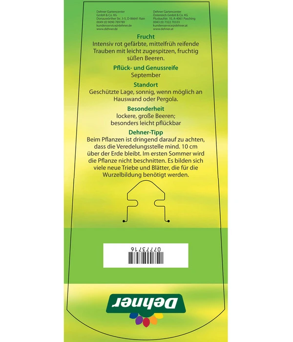 Wenn im Herbst die roten Trauben zwischen dem grünen Laub zum Nähertreten verlocken, dürfen Sie dieser Versuchung ruhig nachgeben und sich die großen, ovalen, knackigen Trauben Ihrer eigenen Weinrebe auch mal frisch vom Strauch schmecken lassen. Die fruchtige Süße mit der erfrischenden Säurenote sind Beere für Beere ein kulinarisches Erlebnis! Bei dem Wein ‘Katharina‘ handelt es sich um eine hochwertige Rebe aus deutscher Züchtung, dessen Sortenschutzinhaber Jörg Wolf aus Bad Dürkheim-Ungestein ist. Die kräftige Pflanze überzeugt auch mit guter Frosthärte und einer guten Toleranz gegen Pilzkrankheiten. Setzen Sie jetzt den Wein ‘Katharina‘ in Ihren Garten und Sie werden die kommenden Jahre aus mehr als einem Grund froh über diese Entscheidung sein. Denn neben den erlesenen Weinbeeren, die jeden Gourmet begeistern, wird auch der Anblick Ihrer prächtigen Weinrebe mit dem üppigen Blattschmuck Ihr Gärtner-Herz höherschlagen lassen. Auch nach der Ernte, wenn die Blätter des Weins einen weithin leuchtenden Blickfang im Herbstgarten bilden.